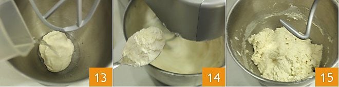 Vierte la masa leudada en el recipiente de una amasadora equipada con pala (si no la tienes, puedes amasar a mano) y añade la mitad de los 550 ml de agua 13; enciende la máquina a velocidad baja, para disolver la masa, luego, una vez disuelta, añade las harinas en forma de lluvia, una cucharada a la vez 14, alternándolas con el agua restante, en la que habrás disuelto la sal. Cuando los ingredientes se hayan reunido alrededor de la pala, desmóntala y monta el gancho 15, con el cual amasarás todo durante al menos 10 minutos a velocidad baja. La masa deberá enrollarse alrededor del gancho y despegarse de los lados del recipiente.