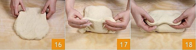 Vierte la masa, bien suave, sobre la mesa de trabajo, ligeramente enharinada: tendrás que darle pliegues para reforzar la masa de modo que la levadura se desarrolle hacia arriba. Estira un poco la masa con las manos 16, dándole forma rectangular, luego da la vuelta al primer lado hacia el centro y haz lo mismo con el otro, superponiéndolo (17-18).