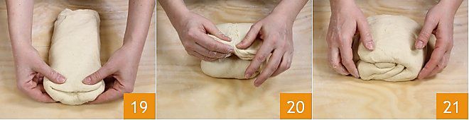 Gira el panecillo, estíralo un poco 19 y vuelve a hacer los pliegues como antes, doblando los lados hacia el centro (20-21). Deja reposar la masa durante 15-20 minutos. Después de este tiempo, realiza los pliegues nuevamente, como ya se ha ilustrado, y deja reposar nuevamente durante 15-20 minutos.