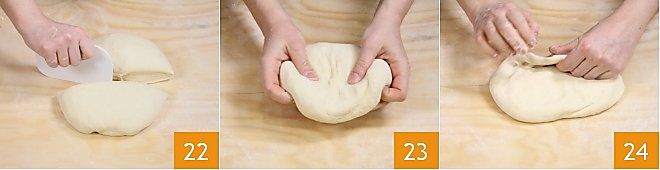 En este punto, si quieres obtener dos barras, divide la masa en dos partes iguales, con las que podrás formar dos panes o dos barras 22. Si prefieres, también puedes obtener un solo pan. Procede ahora de esta manera para las barras: amasa ligeramente un trozo, recogiendo los lados hacia el centro, aplánalo ligeramente 23 luego enrolla el panecillo sobre sí mismo comenzando por un lado 24, presionando con los dedos hacia abajo y enrollándolo hasta el final. Si en cambio quieres un pan, dobla los dos extremos de la barra hacia abajo y redondea la masa.