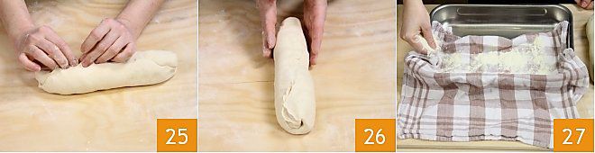Pellizca con los dedos el extremo superior de la barra para hacer que la masa se adhiera 25. Aquí está lista la primera barra 26, procede de la misma manera descrita anteriormente también con el segundo trozo de masa. Ahora toma una bandeja de horno y cúbrela con dos paños limpios, colocados uno al lado del otro y bien doblados para crear un divisor en el centro, bien enharinados con la sémola 27.