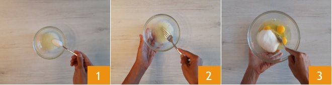 Para preparar el panettone sin levadura, primero coloca las gotas de chocolate en el congelador durante 30 minutos (con este truco las gotas de chocolate no caerán al fondo del panettone durante la cocción). Prepara el glaseado para la superficie y consérvalo en el frigorífico hasta el momento de usar: bate ligeramente la clara de huevo con un tenedor, añade el azúcar 1 y mezcla 2. En un bol pon los huevos y el azúcar y trabaja los ingredientes con un tenedor 3;