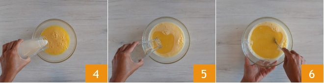 Añade la leche 4, el aceite de girasol 5 y mezcla para amalgamar bien los ingredientes 6.