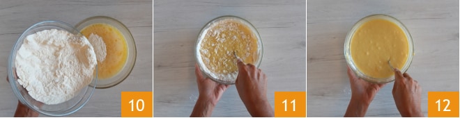 Añade al compuesto de huevos las harinas, poco a poco 10. Continúa mezclando con un tenedor 11 hasta obtener una masa lisa y sin grumos 12.