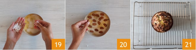 decora con la granella de azúcar 19 y las almendras 20. Hornea en horno estático precalentado a 180° durante 45 minutos, en la rejilla del medio hacia abajo. Antes de sacar del horno siempre realiza la prueba del palillo. Saca el panettone sin levadura del horno 21, déjalo enfriar y sírvelo.