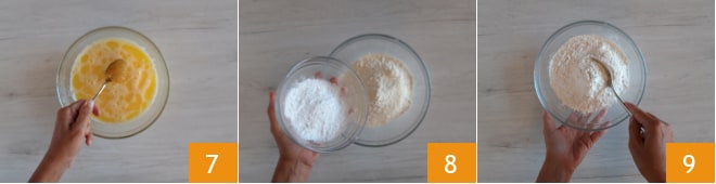 Añade también la miel 7 y mezcla otra vez. En un bol vierte la harina, el almidón de patata 8 y la levadura; mezcla 9.