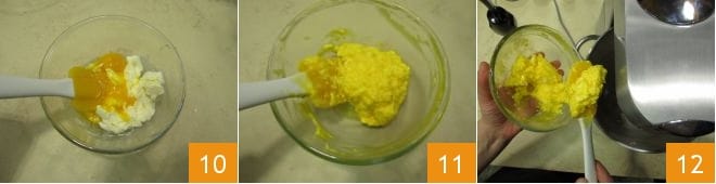 Añade luego las restantes 10 y mezcla nuevamente para obtener una emulsión homogénea 11. En este punto, añade la mitad a la batidora en funcionamiento 12.
