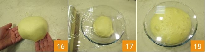Dale una forma esférica a la masa 16, transfiérela dentro de un bol de vidrio, cubre con film plástico 17 y deja leudar durante unas 12 horas a una temperatura de aproximadamente 26° hasta que la masa haya triplicado su volumen 18. Mientras tanto, si prefieres preparar en casa la pasta de mandarinas, naranjas o limones, mira el cuadro al final.