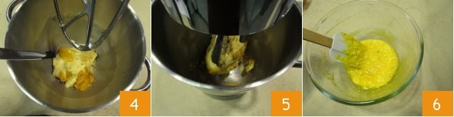 Mezcla con un batidor hasta disolver el azúcar 4; luego vierte el jarabe en una batidora equipada con una pala de hoja 5. Añade los 250 g de harina de manitoba de una vez 6 y comienza a amasar.