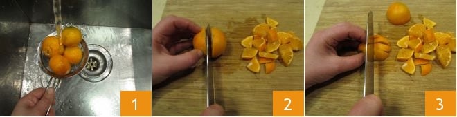 Si quieres, puedes hacer la pasta de los distintos cítricos en casa. Para hacer la de mandarina, primero lávalas 1 y elimina los extremos; luego, sin pelarlas, córtalas primero por la mitad 2 y luego en rodajas que deberás dividir nuevamente por la mitad 3.