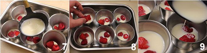 vierte en el molde la primera capa de panna cotta que cubrirá las frambuesas hasta la mitad de su altura 7. Deja que la primera capa se solidifique en el frigorífico durante aproximadamente 1 hora o en el congelador durante 30 minutos; mientras tanto, cubre la mezcla restante con una capa de film, haciendo un pequeño agujero en la superficie para que pase el aire y mantenla a temperatura ambiente, alejada de fuentes de calor, mezclando con el batidor de vez en cuando. Pasado el tiempo indicado, coloca otras dos frambuesas dentro del molde 8 y cubre con la segunda capa de panna cotta 9.