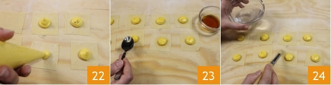 Vierte el relleno de calabaza y pecorino de fossa que has triturado en una manga pastelera y rellena los cuadraditos de pasta al huevo que has cortado 22. Luego, agrega el licor amargo de hierbas aromatizado con limón y, ayudándote con una cucharadita, coloca una gota sobre cada paquetito 23. Pinta los cuadraditos de pasta al huevo con agua para favorecer el sellado 24.