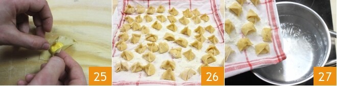 Procede al cierre de los paquetitos pellizcados: une dos esquinas opuestas de cada cuadradito 25, haz que los lados se adhieran para cerrar el relleno y luego une los dos bordes restantes, pellizcándolos y formando un paquetito. Luego, cubre una bandeja con un paño bien espolvoreado con harina y transfiere los paquetitos que has realizado 26. Llena una olla grande con agua salada y lleva a ebullición, luego vierte los paquetitos y cocina por unos minutos 27.