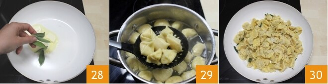 Mientras tanto, derrite la mantequilla en una sartén antiadherente y agrega algunas hojas de salvia 28. Cuando los paquetitos pellizcados floten en la superficie, escúrrelos con una espumadera 29 y saltéalos en la sartén con la mantequilla y la salvia. Condiméntalos con pecorino rallado y los paquetitos pellizcados de calabaza y pecorino de fossa están listos para ser servidos y disfrutados 30!