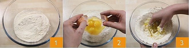 Para preparar los paquetitos pellizcados con relleno de calabaza y pecorino de fossa, comienza preparando la pasta al huevo. Vierte la harina 00 en un bol grande 1, o directamente sobre una superficie enharinada, agrega los huevos 2 y comienza a amasar a mano 3.