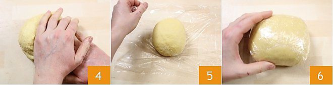 Transfiere la masa a una superficie enharinada, si comenzaste a trabajar la masa en un bol, y sigue amasando 4 hasta obtener una masa firme y compacta 5. Luego, cubre la masa con una película transparente 6 y deja reposar a temperatura ambiente durante 1 hora. Para descubrir cómo preparar la pasta al huevo de la mejor manera, consulta la Escuela de cocina: pasta fresca al huevo (lámina y formatos).