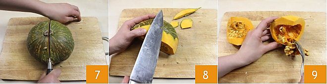 Mientras tanto, ocúpate de la calabaza: colócala sobre una tabla de cortar y divídela por la mitad 7. Luego toma una mitad, elimina lateralmente la piel con un cuchillo 8 y extrae las semillas internas ayudándote con una cuchara 9.