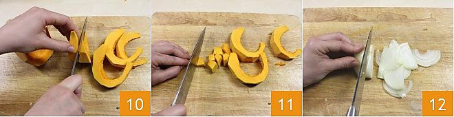 Luego corta la mitad de la calabaza en rodajas 10 y de las rodajas corta daditos 11. Toma media cebolla, límpiala y pícala finamente 12.