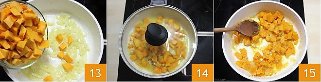 Vierte un chorrito de aceite en una sartén antiadherente y sofríe la cebolla picada a fuego lento. Cuando la cebolla esté bien dorada, agrega la calabaza en daditos 13. Cubre con una tapa y cocina a fuego lento durante unos 30 minutos, añadiendo agua o caldo según sea necesario 14. Deja secar bien la calabaza en daditos, de lo contrario, al triturarla, liberará demasiada agua 15.