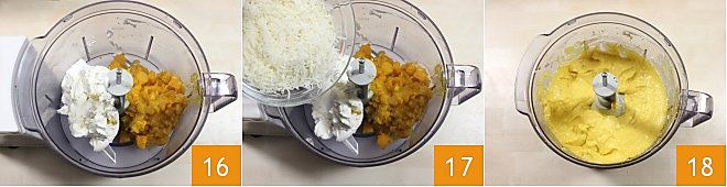 Una vez cocida, transfiere la calabaza a un procesador de alimentos con la ricotta 16. Agrega también el pecorino de fossa que has rallado previamente 17 y ajusta de sal y pimienta al gusto. Tritura todo hasta obtener una crema homogénea 18.
