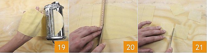 Pasado el tiempo de reposo de la pasta, extiéndela con una máquina de pasta: primero corta un trozo de masa, para que pase más fácilmente a través de la máquina. Aplana con las manos el trozo que has cortado y coloca la perilla lateral de la máquina en el grosor más ancho. Haz pasar la masa varias veces y a medida que se vuelva más fina, reduce el grosor de la máquina, hasta obtener una lámina delgada 19. Consulta la Escuela de cocina: estirar la lámina con la máquina, que encuentras aquí, para descubrir todos los pasos de este proceso. Una vez extendida la pasta, recorta cuadraditos de 5X5 cm (20-21).