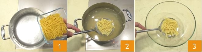 Para preparar la pasta a la checca, primero lleve a ebullición una olla con abundante agua salada y vierta los sedanini estriados 1. Cocine la pasta, escúrrala al dente 2 y transfiera a un bol 3. Condiméntela con un poco de aceite de oliva virgen extra para que no se pegue, y déjela enfriar un poco.