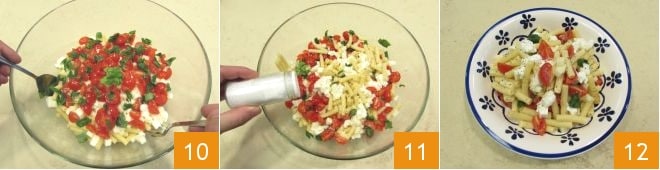Mezcle bien para amalgamar los sabores 10 y ajuste de sal y pimienta 11: ¡su pasta a la checca está lista para ser disfrutada 12!