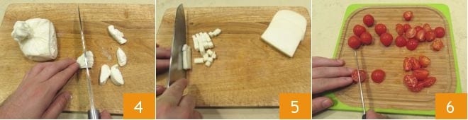 Mientras tanto, ocuúpese del condimento: corte la burrata en tiritas 4 y la caciotta romana en dados 5. Lave los tomatitos en abundante agua corriente fresca y córtelos en cuartos 6.