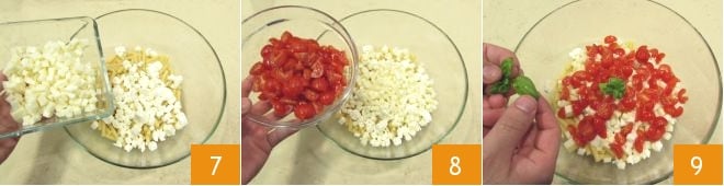 En el bol donde ha dejado enfriar la pasta, añada la burrata y la caciotta romana en dados 7. También agregue los tomatitos 8 y la albahaca troceada a mano 9.