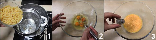 Para preparar la pasta cacio e ova, pon a cocer los tubetti en agua hirviendo con sal durante el tiempo indicado en el paquete 1. Mientras tanto, en un bol, rompe los huevos con un batidor 2 y sazona con sal y pimienta 3.