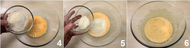 Añade a los huevos el pecorino rallado 4, mezcla y finalmente agrega el parmigiano rallado 5. Obtendrás una mezcla clara y espesa 6.