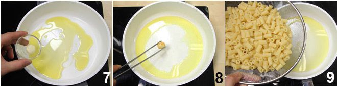 En una sartén antiadherente, calienta el aceite de oliva virgen extra y dora en él un diente de ajo 7; apenas esté dorado, elimina el ajo 8 y apaga el fuego. Los tubetti estarán listos: escúrrelos y saltéalos durante un minuto en el aceite sazonado con el ajo 9.