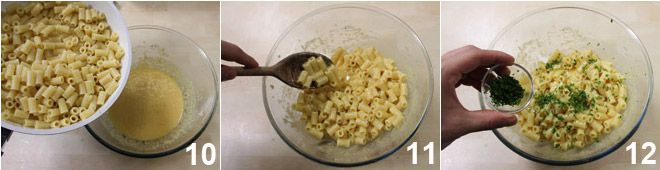 Espera a que los tubetti se templen y únelos a la mezcla de huevos y cacio directamente en el bol 10: mezcla bien con una cuchara de madera para que la pasta se amalgame bien con los huevos 11 y finalmente completa con una buena espolvoreada de perejil picado 12. ¡Aquí tienes tu pasta cacio e ova lista!