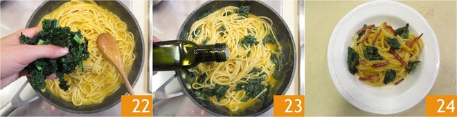 Añade la col rizada 21 y un chorro de aceite 22. Termina de cocinar la pasta añadiendo más agua si es necesario. Cuando esté lista, emplata, termina con el speck crujiente 23 y si te gusta, con una pizca de pimienta. El plato está listo para ser servido bien caliente.