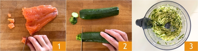Para preparar la pasta con salmón y calabacines, primero prepara todos los ingredientes: quita la piel del filete de salmón y elimina cualquier espina con unas pinzas, luego córtalo en cubos 1. Corta los extremos de los calabacines 2 y córtalos en juliana usando una mandolina o un procesador de alimentos 3.
