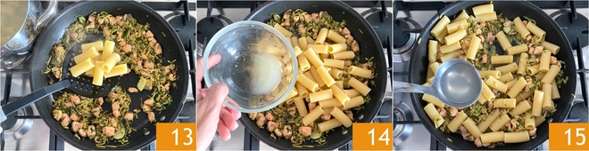 Cuando la pasta esté al dente, escúrrela en la sartén con el condimento, asegurándote de conservar el agua de cocción 13. Saltea todo a fuego alto, luego añade pimienta 14 y desglasa con el jugo de limón colado 15.