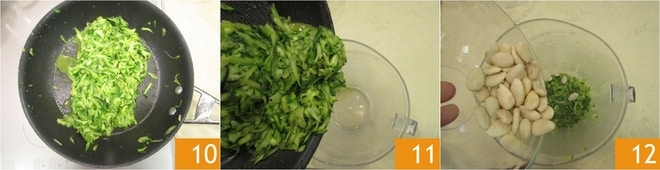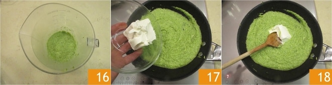 Tritura hasta obtener una crema lisa 16. Transfiere la crema obtenida a la sartén, añade la robiola 17 y diluye con un poco de agua de cocción de la pasta. Remueve para mezclar la robiola de manera homogénea 18.