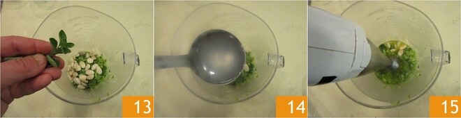 Añade también las hojas de orégano 13, un cucharón de agua de cocción 14, el queso rallado y tritura con una batidora de mano 15.