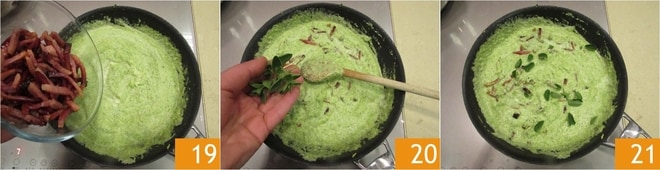 Añade también el speck 19 y algunas hojas de orégano 20. Mezcla bien 21.