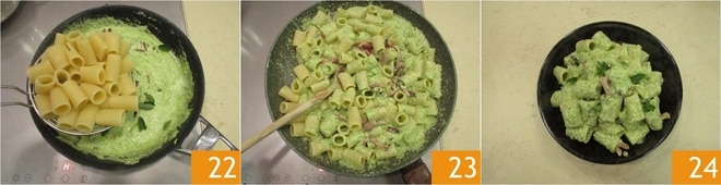 Escurre la pasta y transfiérela directamente a la sartén con el condimento 22. Mezcla bien 23 y sirve inmediatamente la pasta cremosa speck y calabacín 24.