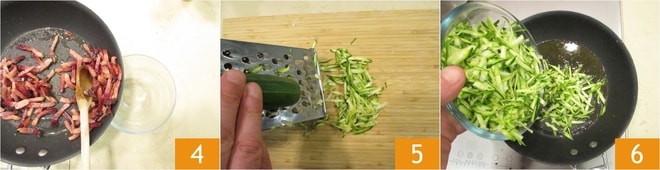 Transfiere a un bol pequeño 4 y resérvalo. Ahora lava los calabacines y rállalos con un rallador de agujeros grandes 5. En la sartén donde has cocinado el speck, vierte un poco de aceite y añade un diente de ajo sin pelar. Deja que se impregne y añade los calabacines 6.
