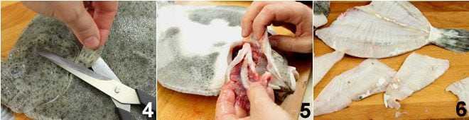 y las dos laterales 4; luego con la punta de un cuchillo haga una pequeña incisión en el estómago para extraer las vísceras 5. Pélelo con la hoja afilada de un cuchillo, en este punto deshuéselo y obtenga 4 filetes 6.