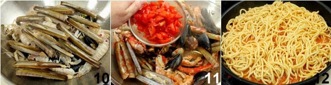 Para preparar la pasta y pescado en guiso, comience limpiando todo el pescado: limpie muy bien bajo el agua fría los mejillones eliminando aquellos rotos o abiertos, luego quíteles la barba que sobresale de las valvas y raspe la concha con un cuchillo o con una esponja nueva de acero (Cómo limpiar y abrir los mejillones) en cuanto a las almejas finas, aquí hay un truco para eliminar las llenas de arena: ármese de paciencia y tómelas una por una, golpee la almeja con la parte de corte sobre una tabla de madera 1 y verifique si sale negro. Si esto sucede, deseche la almeja porque estará llena de arena muy oscura. Enjuague las galeras bajo el agua fría y las navajas 2.