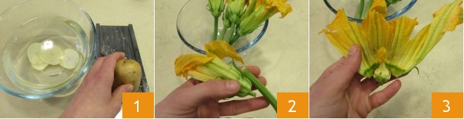 Para realizar el pastel, primero lava y seca las patatas con la piel, luego córtalas finamente con una mandolina 1 y guárdalas en un bol lleno de agua para que no se oscurezcan. Toma las flores de calabacín y corta el tallo 2, separa las hojas de la base de la flor. Para eliminar posibles residuos de tierra dentro de la flor, pásales delicadamente un pincel. Abre la flor y elimina el pistilo 3.