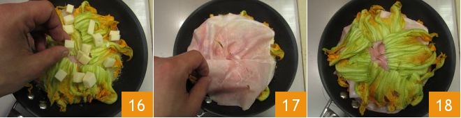 distribuye también la mitad de la dosis de cubitos de fontina 16. Continúa con el resto de la dosis de jamón cocido 17 y las flores de calabacín restantes 18