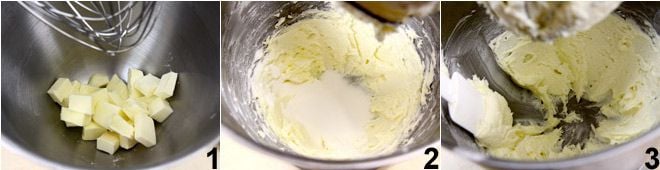 Comienza la preparación de la devil's food cake cortando la mantequilla en cubos y dejándola ablandar 1 (o ablandándola en el microondas). Bate con las varillas de una batidora la mantequilla ablandada a velocidad moderada y cuando esté clara y espumosa añade el azúcar y las semillas de la vaina de vainilla 2 y continúa batiendo por unos minutos más, asegurándote de vez en cuando de quitar la mezcla de los bordes del bol con una espátula suave 3.