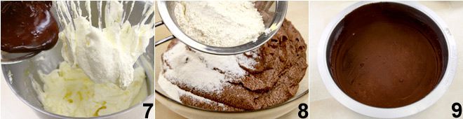 Incorpora la crema de cacao ya fría 7 a la mezcla de mantequilla, huevos y azúcar. Añade a la mezcla obtenida la sal, la harina y el bicarbonato tamizados 8, luego mezcla suavemente todos los ingredientes. Unta con mantequilla y espolvorea con cacao 3 moldes de 22 cm de diámetro 9,