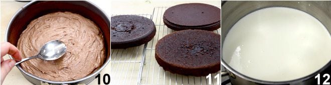 luego divide la masa en tres partes iguales y colócala dentro de los 3 moldes 10. Hornea los moldes en el horno ya caliente a 180 grados durante unos 30-35 minutos, luego cuando las tres tartas estén cocidas 11 sácalas del horno, déjalas enfriar durante 15 minutos y retíralas de los moldes colocándolas sobre una rejilla. Mientras tanto prepara la crema de relleno/cobertura de la devil's cake poniendo en una cacerola grande la nata 12 y llevándola a casi hervir.