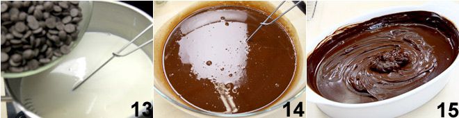 Agrega en la cacerola el chocolate negro 13 y mezcla bien hasta obtener una mezcla lisa y homogénea 14. Retira la cacerola del fuego y deja enfriar la mezcla a temperatura ambiente mezclando cada 15 minutos; luego, colócala en el frigorífico hasta que el compuesto se endurezca (recuerda siempre mezclar cada 15 minutos) y hacerlo bastante sólido pero untuoso 15.