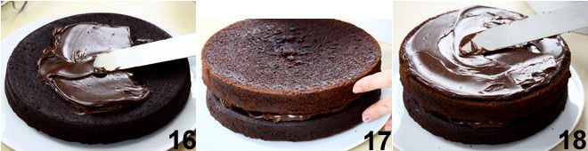 Pon uno de los tres discos ya fríos en un plato, úntalo con la crema de chocolate 16, cubre con un segundo disco 17 y cubre también este con la capa de chocolate 18.